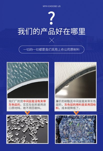 当然以聚氯乙烯(PVC)为主要材料的价格也是决定树脂瓦价格和质量好坏的材料。有些不负责的厂家为了提高利润降低质量,用再生PVC粉料生产树脂瓦。