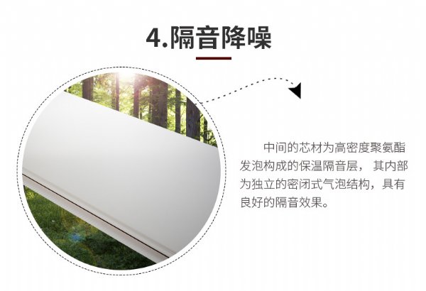 聚氨酯发泡构成的保温隔音层,其内部为独立的密闭式气泡结构,具有良好的隔音效果。适用于噪音区附近的公寓、医院、学校等建筑,有效降低室外噪音进入室内,保持室内环境安静舒适。