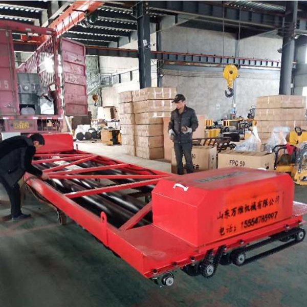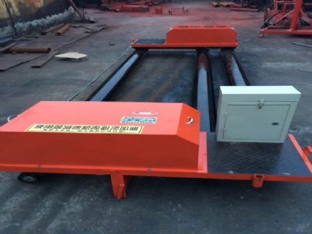 ①将机器运至施工现场,两行走辊平放于模板上(也可先接通电源,启动行走电机。使机器沿事先搭好的斜坡行驶至模板上)