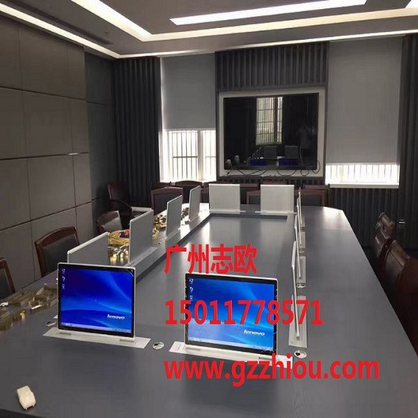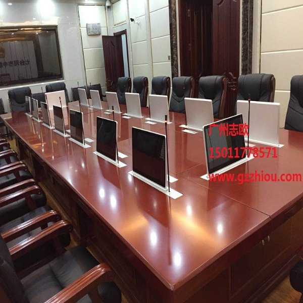 升降机把显示屏从会议桌下面自动升到桌面并仰成一成角度,符合人机工程学原理,产品也可以左右调节角度,更有利于办公演示的需要,当不使用时显示屏可自动下降隐藏于会议桌内部,并自动关门,超薄液晶升降器具有防盗、防尘保持桌面平整,美化桌面等功能。