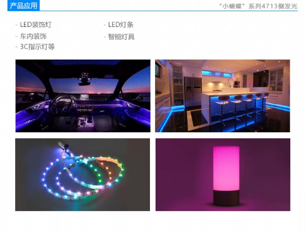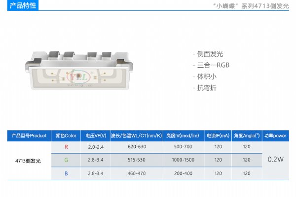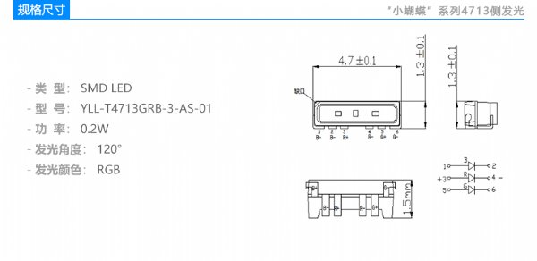 小蝴蝶侧发光4713rgb LED灯珠,工厂十多年研发经验,产品经过多项实验测试,质量稳定,低光衰,亮度高。产品应用:LED装饰灯、LED