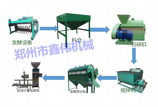 粉状有机肥生产线设备配置: 发酵设备—自动配料机--湿物料