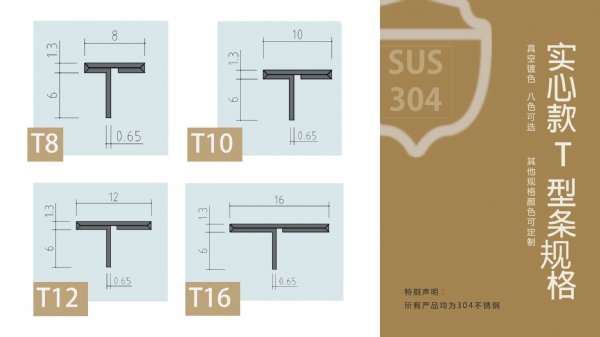 本产品常备规格T6、T8、T10、T12、T16,长度有2.44米和3.05米两种,表面纹理有砂面、光面,颜色有黄钛金、银色、玫瑰金、黑钛金四种,其他规格可以定制;