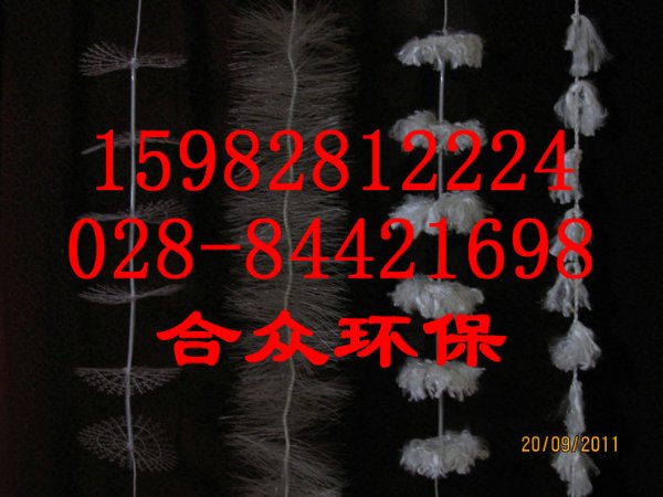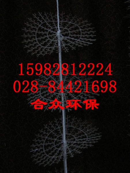 聚酰胺中的几种耐腐、耐温、耐老化的优质品种,混合以亲水、吸附、抗热氧等助剂,采用特殊的拉丝,丝条制毛工艺,将丝条穿插固着在耐腐、高强度的中心绳上,由于选材和工艺配方精良,刚柔适度,使丝条呈立体均匀排列辐射状态,制成了悬挂式立体弹性填料的单体,弹性填料在有效区域内能立体全方位均匀舒展满布,使气、水、生物膜得到充分混渗接触交换,生物膜不仅能均匀地着床在每一根丝条上,保持良好的活性和空隙可变性,而且能在运行过程中获得愈来愈大的比表面积,又能进行良好的新陈代谢,这一特征与现象是国内目前其他填料不可比拟的。