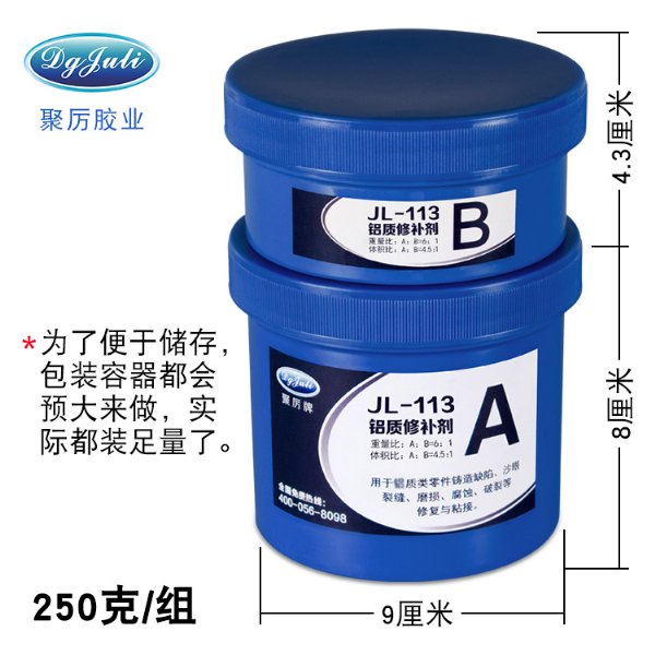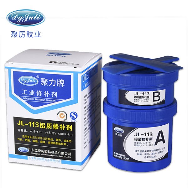 修补胶固化后具有优异的机械性能,可进性钻孔、车牙、切削、砂磨及攻丝等各种机械加工,聚力铝质修补胶固化后无收缩,并可进行各类机械加工,在不允许动火电焊的工作环境可取代电焊进行冷焊修补,JL-113铝质修补剂与被修补金属机体结合强度高,并与金属颜色几乎一致,聚力铝质修补胶具有抗磨损、耐油、防水、耐各种化学腐蚀等优异性能。