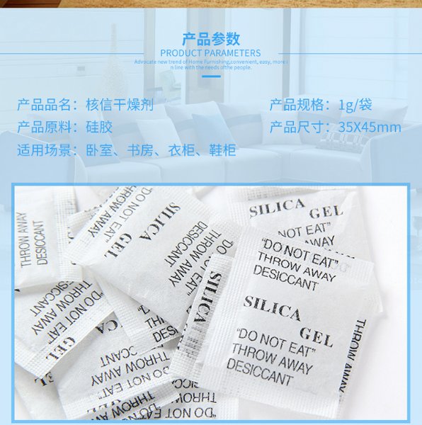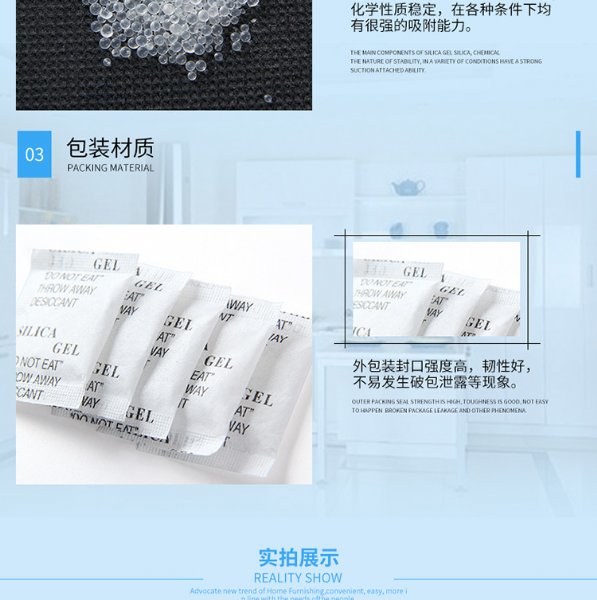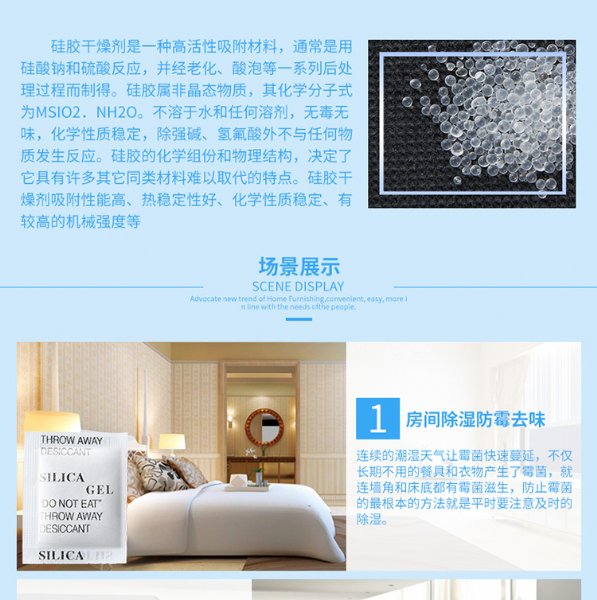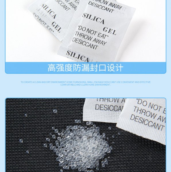 二氧化硅,*、无味、无嗅,化学性质稳定,具强烈的吸湿性能。因而广泛用于仪器、仪表、设备器械、皮革、箱包、鞋类、纺织品、食品、药品等的贮存和运输中控制环境的相对湿度,防止物品受潮,霉变和锈蚀。