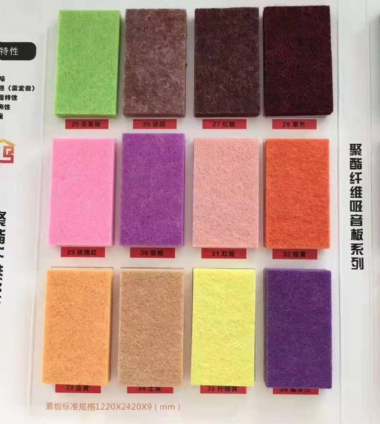 是一种理想的吸声装饰材料。其原料为100%的聚酯纤维,具有环保、阴燃、隔热、保温、防潮、防霉变、易除尘、易切割、可拼花、施工简便、性价比优等特点,有多种花纹和颜色可供选择,可满足不同风格和层次的吸音装饰要求。