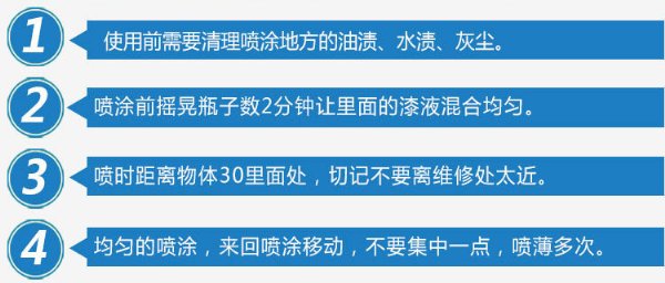 1、喷涂本品前,先使用除蜡剂清洁表面,彻底去除需喷漆部位的油污、水渍和尘埃。