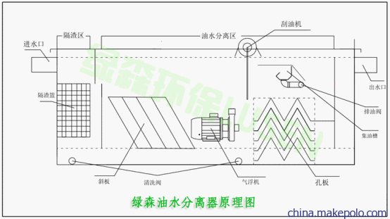 油水分离器,主要结构由自动排渣、自动刮油、气浮装置、恒温装置组成。当废水排水流入清渣系统时,