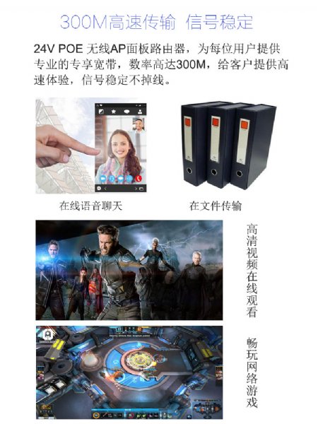 采用IEEE802.11n无线2T2R MIMO技术,传输速率可达300Mbps, 可以配合POE