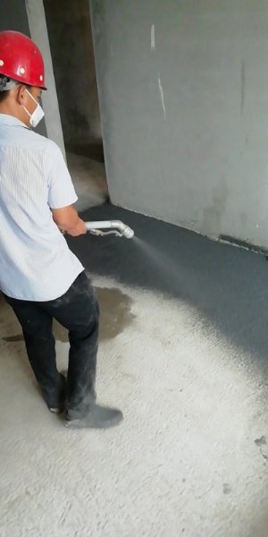 施工工艺:喷涂前严格要求:要清扫地板和墙表面浮尘土,必须要去掉凹凸不平的颗粒和松散杂物杂质,将灰渣铲干净、扫净,底材不能有油污油脂和蜡质,适当洒水湿润,一般地板面洒水后,表面干洁后,就可以喷涂了。墙体和天花顶不需要洒水。如果是地面可以抹涂刮涂,也可以喷涂。 墙身和天花顶,建议喷涂。