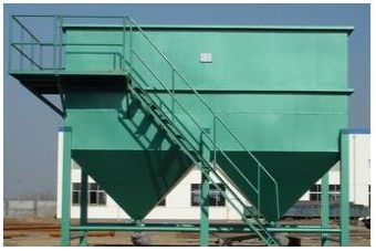 废水由进水管进入池体混凝反应槽,在位于池体中间的进水廊道内通过折流板流动,再通过布水口进入一级斜管。随着水流向上流动,其所含的固体颗粒就沉淀在平行的一级斜管组件上,然后滑入池体底部的污泥斗,在污泥斗中,污泥经浓缩后通过污泥出口排出。而其澄清液沿斜管上升,通过顶部的通路孔流入集