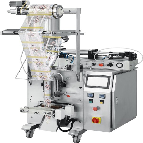 自吸泵定量充填,直热封切,制袋尺寸、包装重量、封切温度调节方便可靠,生产日期色带打印,边封、背封,光电跟踪。