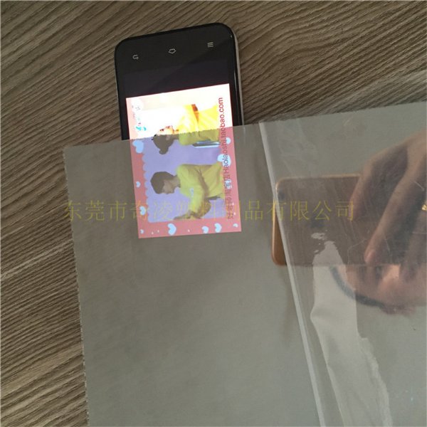 半透镜(双面反光和透光)——透明板材→真空电镀→单面电镀→半透镜→双面覆PE保护膜(有光可以看到里面的东西也可以透光或图像出来,没有光是镜子效果。)常规透光度10度 15度 20度 30度 ,其他透光度可以定做。