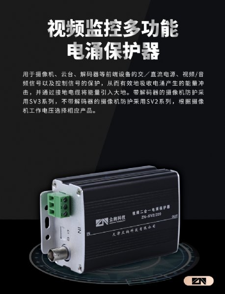 电源、视频/音频信号以及控制信号的保护,从而有效地吸收电涌产生的能量冲击,并通过接地电缆将能量引入大地。带解码器的摄像机防护采用SV3系列,不带解码器的摄像机防护采用SV2系列,根据摄像机工作电压选择相应产品。多功能一体化设计,降低了保护成本和安装难度,节约了安装空间,大大提升了对摄像机的综合保护效果。