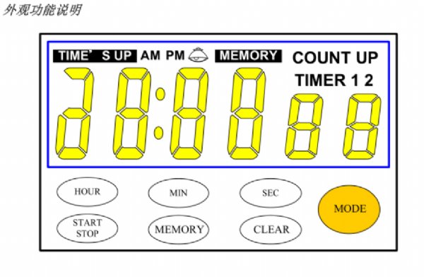 (7) 7 按键: 模式(MODE), 小时(Hour), 分(Min), 秒(Sec), 开始/停止(Start/Stop),