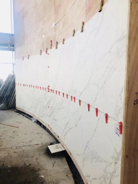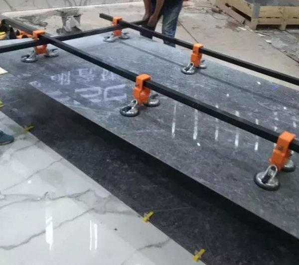用三孔玻璃吸工具平抬大板平移施工位置,放置到铺好的瓷砖胶基面上,至少需要两名工人进行搬运,面积更大的需要使用移动架搬运。