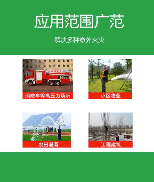 在高压作用下使两者紧密结合而成,是消防装备的理想配套产品。也可广泛用于船舶、石化、水利、绿化等领域。