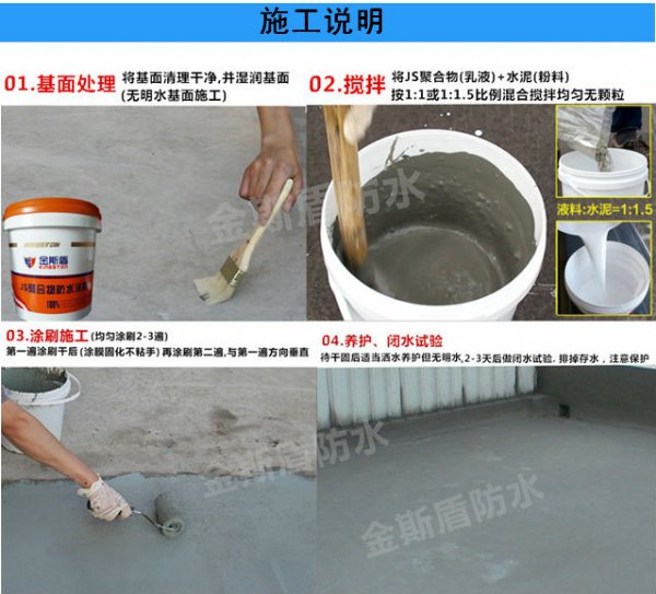 1.按防水涂料:水泥=1:1.5的重量比搅和均匀,防水胶浆脚稠时,允许加适量的水冲稀,参量小于2%。水泥要求为32.5R以上硅酸盐水泥