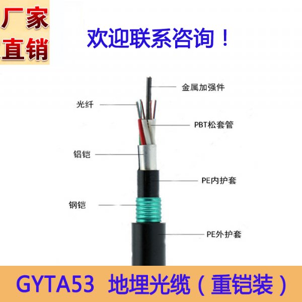 GYTA53光缆又称重铠装地埋光缆,我们欧孚厂家专业生产国标GYTA53光缆,GYTA53光缆之所以叫重铠装地埋光缆是因为:有一层铝铠装一层钢铠装两层护套保护,它的机械性能非常好。欧孚国标GYTA53光缆让您使用放心,使用安心。