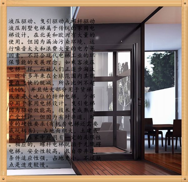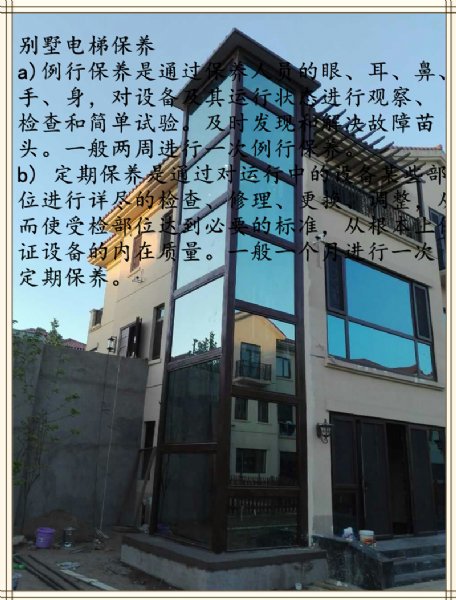 别墅电梯应采用无机房家用电梯结构,现有的住宅如果需要加装电梯,因为无法再破坏房屋原有的结构,应采用无底坑自带井道家用电梯,从而*大限度的节约了建筑费用和建筑空间,同时照顾到了房屋的外观和美观度。