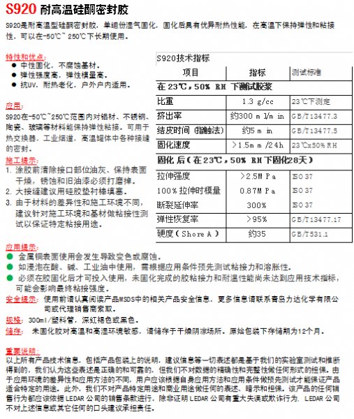 ,单组份湿气固化,固化后具有优异耐热性能,在高温下保持弹性和粘接性,可以在-50℃~ 250℃下长期使用。