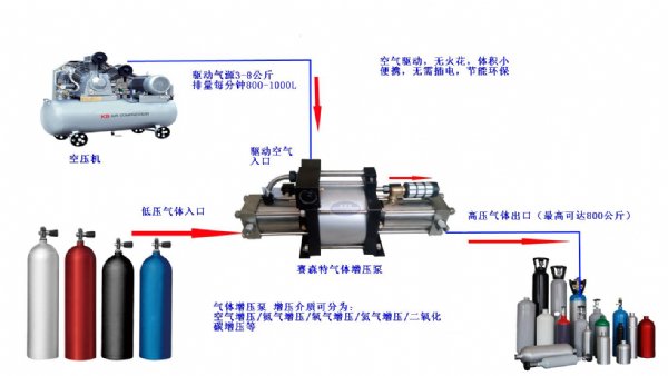 气体增压泵的*大耗气量为0.6m3/min, 按照常规充气情况,可选0.6-1m3/min排量的空压机就可。