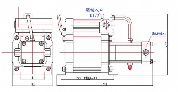增压泵采用单气控非平衡气体分配阀来实现泵的往复运动,全部采用铝合金机
