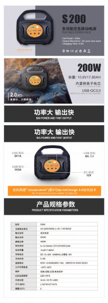 PECRON-S200 电源可应用于一系列的智能产品,如手机,卫星电话,数码相机,移 动硬盘,数码相机,平板电脑,LED 灯,笔记本电脑,汽车启动,户外照明,