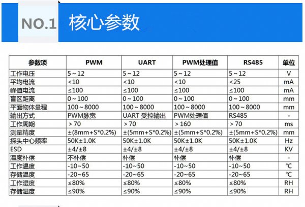 电容式静电换能器探头设计,灵敏度非常高。传感器模块带有稳定温度输出,温度补偿功能,在10cm至800cm范围内,能够准确探测出与平面物体间的距离,并且在10cm至300cm范围内,能够准确检测人体。多元化输出端口设定,可支持UART输出、PWM输出及RS485输出。传感器模块广泛应用各场景高精度测量身高仪器、飞控定高、人工智能等。