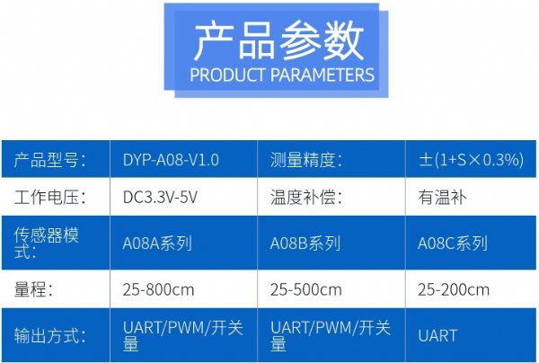 传感器 A08系列模组,是一种使用超声波传感技术进行测距的模组。模组采用高性能处理器、高品质元器件,产品稳定可靠 、使用寿命长。模组使用防水型超声波换能器,工作环境适应性强。模组内置高精度测距算法和功耗管理程序,测距精度高、功耗低。