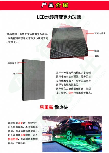 地砖屏做为一种新型舞台显示设备广泛用于-酒店-酒吧-婚庆-大型演唱会活动主题公园,LED地砖屏采用优质进口SMD3535超高亮半导体