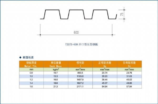 楼承板,由中冶研发(原先的冶金建筑总院),它的肋高为75mm,由三个波组成,每个波距为200mm,整板宽度为600mm,它的展开宽度为1000mm,使用率为60%。