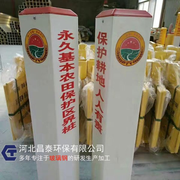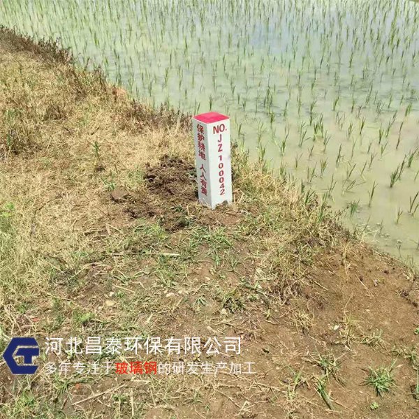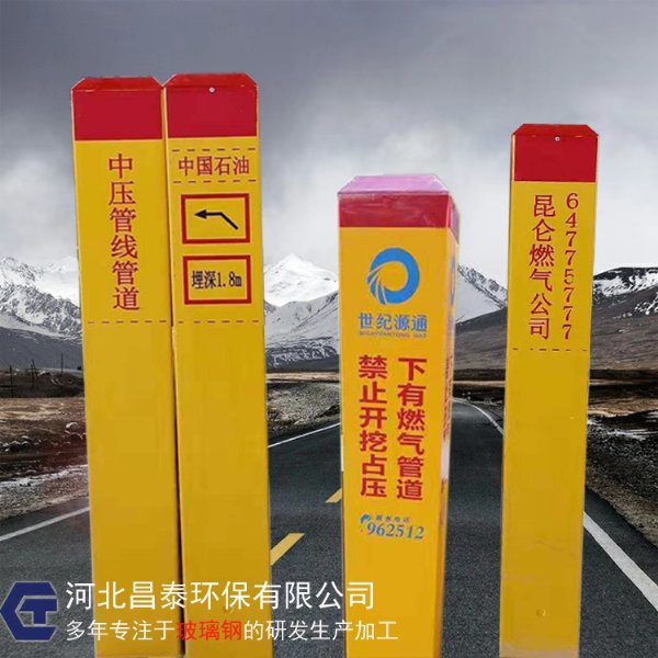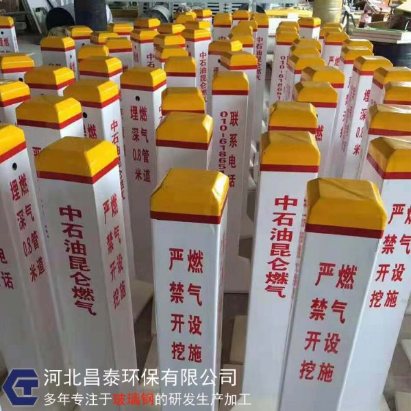 玻璃钢标志桩:经高温压制而成。抗冲击,耐磨损,耐高温,耐腐蚀,可以抗水、汽油、酒精、电解盐、醋酸、盐酸、钠钾化合物、尿、沥青,适合各种酸碱土壤。使用寿命长达30年。内容采用丝网印刷技术,警示效果好,不需要维护。重量轻,便于运输安装。无回收价值,自然防盗。