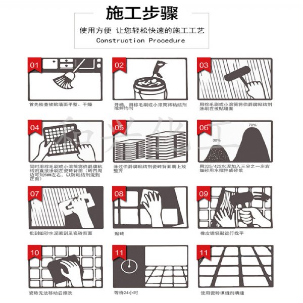 本产品适用于釉面砖,通体砖,抛光砖,玻化砖,防滑砖,仿古砖,大理石,花岗石,石灰岩,板岩等瓷砖,玻璃,石材在外墙,内墙,地面,夹板上等的粘贴,并可用于旧砖墙改造,夹板上扇灰,以及防止扇灰层和批荡层脱落等