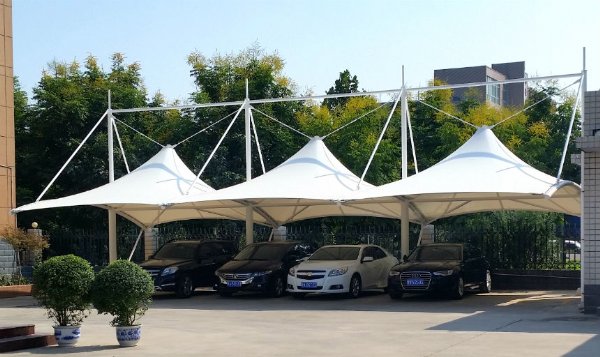 钢板,二者的透光性和膜结构相比,膜结构材料的透光性达到13%,而且膜结构作为一种高分子布的话,不会因为长时间的直晒变黄,也不会物理特性发生变化,比如变脆,软化等现象。是近年来在国内开始流行的一种新式的车棚结构。它与以往的旧式车棚相比,结构更加轻盈,而且在使用中比较稳固。它的材料使用了高分子膜结构材料和支撑构件共同组成,并且能根据支撑构件的高低位置不同而呈现不同的形状。因此在教育,商业,体育馆等公共场所都有很广泛的应用,车棚在*初是作为一种能提供给车辆停泊的地方,使车辆避免了直接面对风吹雨打。用来保证自行车、汽车等在张拉膜车棚下不受损伤。在膜结构车棚未出现之前,市场主要的是铁制车棚,铝合金车棚,彩钢车棚等。这些车棚都是采用金属构件来制作,因此具有笨重,形式单调的缺点。下面我们结合膜结构车棚来和这些金属车棚做一下对比,来说一下膜结构车棚受欢迎的理由是什么?