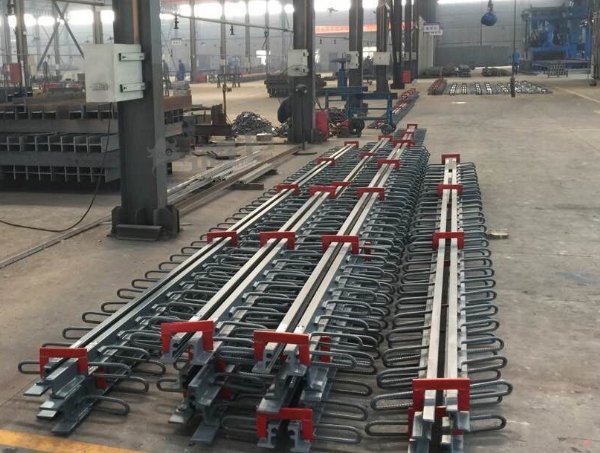 4.当要安装的伸缩缝就位用吊车吊运时,应检查好吊车的吊钩,防止脱钩,吊装时应严格按照厂家预留的吊位进行吊装,并按照设计图纸绑轧钢筋。在固定过程中采用拉线的方法控制