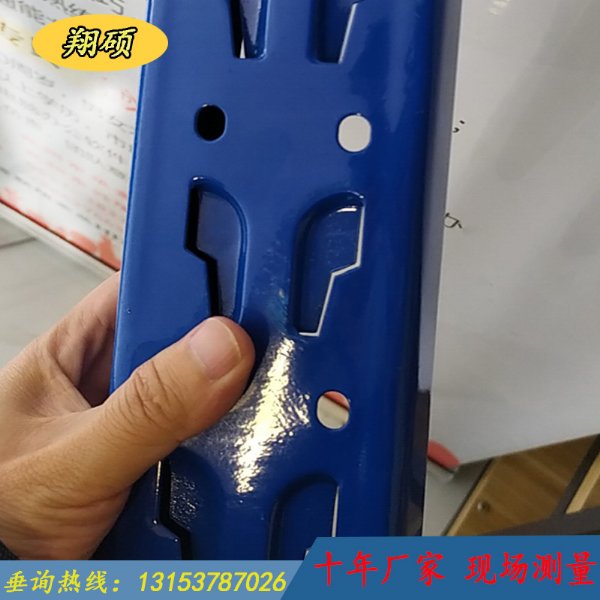 螺丝,安装时只需要将横梁和层板依次安装好就可以了,这类立柱的材料厚度一般有0.7、0.8、1.0、1.2、1.5,因为蝴蝶孔立柱的结构性的问题,此规格型号的立柱一般适用于承重较轻的仓储中,厚度不超过1.5。承重一般在500kg左右。