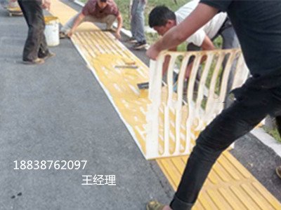 是根据《城市道路和建筑物无障碍设计规范》,解决沥青和混凝土等整体铺装路面上加铺盲道的问题,在现有平整路面上通过铺装模具,并在模具上加铺VSS聚合物*材料而形成盲条或盲点的连续现浇型盲道。