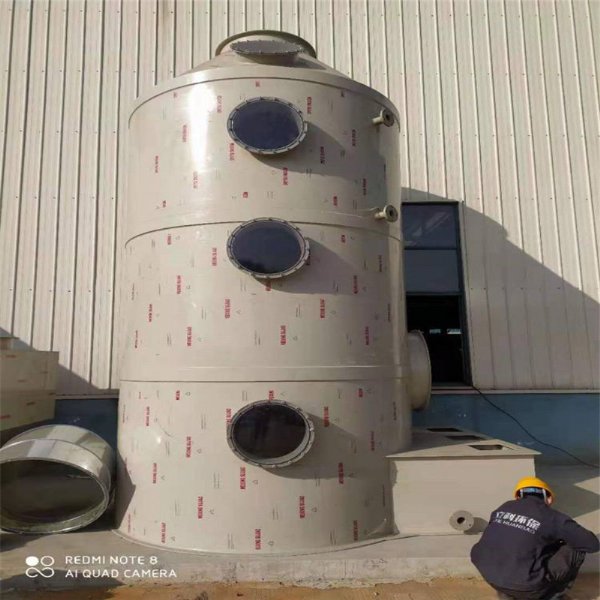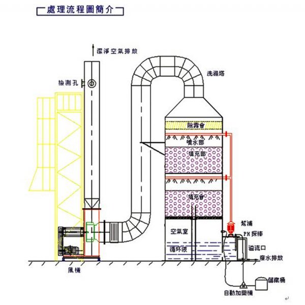 酸雾洗涤塔利用气体与液体间的接触,而将气体中的污染物传送到液体中,然后再将清洁气体与被污染的液体分离,达到清净空气的目的。废气经由填充式酸雾洗涤塔,采用气液逆向吸收方式处理,即液体自塔顶向下以雾状(或小液滴)喷撒而下。废气则由塔体(逆向流)达到气液接触之目的。此处理方可冷却废气、调理气体及去除颗粒,再经过除雾段处理后,排入大气中。