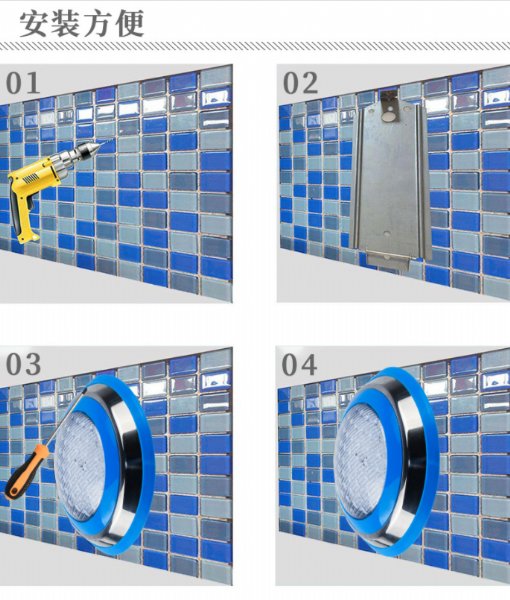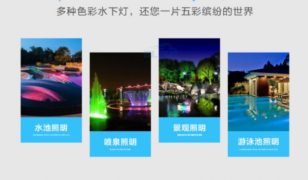 有不同种类可供选择。不同瓦特可供选择。 这些LED水下灯具有ABS盖或ABS + SS盖,内部有硅胶防水,安装方便,防水质量好,安全可靠。是IP68池灯,12V安全电压。