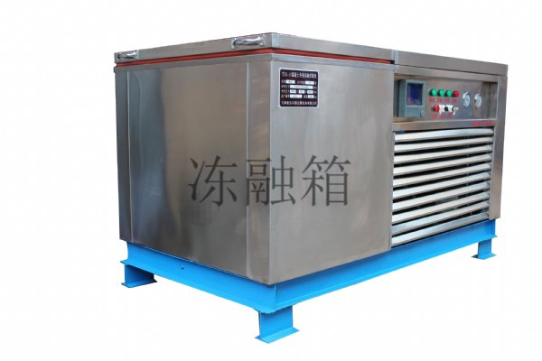 以动弹性模量、重量损失和相对耐久性指数作为评定指标的混凝土抗冻性试验。该设备采用水冻融法,将标准混凝土试件置于橡胶筒中以水浸泡,然后把装有试件和水的橡胶排列在试箱中,用载冷剂作循环介质,周期性把试件周围的水层冻结、融解。全自动混凝土快速冻融
