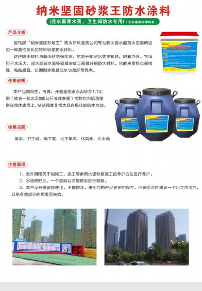 这种防水涂料与基面粘结强度高,抗开裂和耐水效果很好,附着力强。它适用于水压大,迎水面背水面等疑难杂症工程*好的