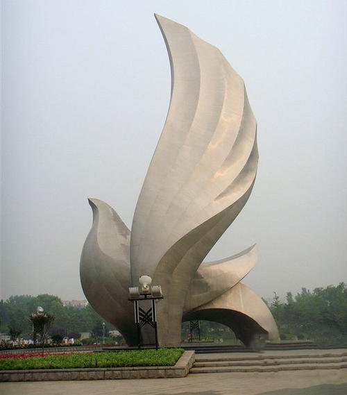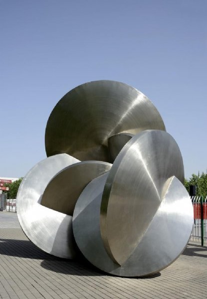 不锈钢板拿到模具上实打实地去敲,根据模型每个部分不同的形状把料下出,依照其起伏变化,进行有意识地敲打,该弯的地方敲弯,该棱的地方敲棱,可在任何有形的结实的物体上进行敲打,然后把敲好的不锈钢板拿到模具上去比较,认为形体正确并完全可以与模型合上,再把这些零散的碳钢板、不锈钢板从上至下一块块焊接起来,每接上一块都要对着模具进行调整,每块不锈钢板表面的肌理效果都要保持相同,这须在做形的同时锻制上去。