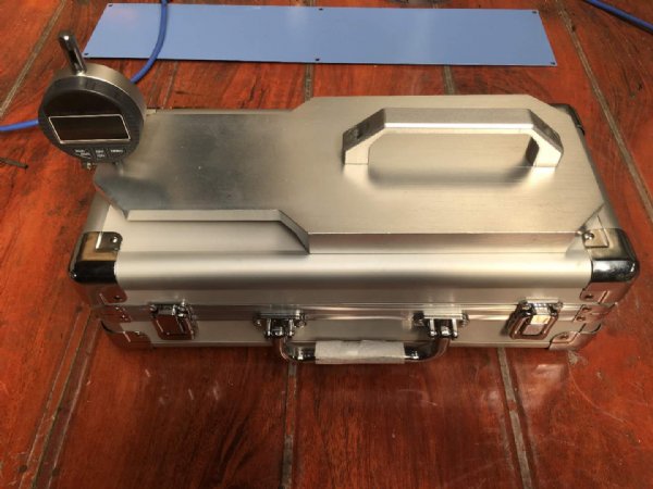 在进行测量时手持仪器本体,前端朝向石膏板棱边方向,按在石膏板上,同时慢慢向棱边方向移动,待定位舌伸出以后再将仪器稍稍往后移动,使定位舌紧紧靠棱边边缘,此时即可以从百分表上读出所测楔形棱边深度。在整个过程中,应尽量使仪器本体与石膏板棱边垂直,特别在读数时,否则会引起误差。