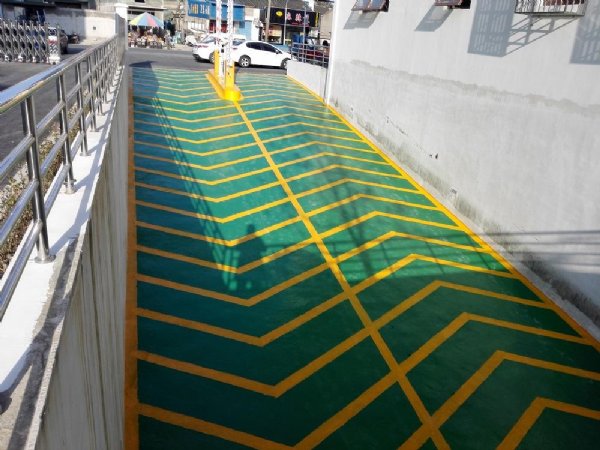 彩色防滑路面。施工路面应干燥平整,凹凸不平的路面会增加材料的使用量。