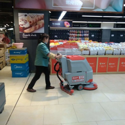 清洁设备,集放水、刷地、污水回收为一体,对于硬质光滑地面的清洁效果尤为卓越,能够快速彻底的将超市地面脚印污渍刷洗干净,吸水扒将这些污水污渍彻底吸干,不留水痕污渍,比人工拖地更干净,为超市带来一个干净明亮的环境。