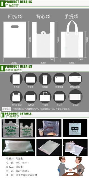 本产品为定制产品,袋子颜色,规格厚度,印刷内容根据客户要求定制。袋子承重大,封底不漏,装水都没问题。广泛用于水果蔬菜批发市场,超市,图文店,图书批发市场,海鲜批发市场,医药超市,五金等各个行业。价格便宜,免费设计,量大从优。