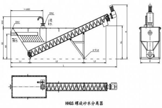 支撑架和驱动装置组成。砂水混合液进入进料沉淀斗后经过斜板沉淀,水从溢流槽排出,螺旋轴将沉砂从水中提升出水面后排放。