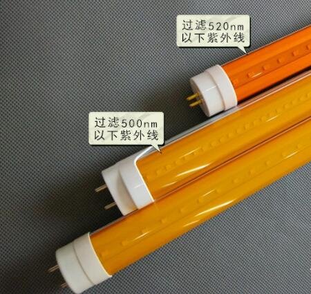 有些传统玻璃黄光灯管就能看见一层亮亮的黄纸,就是用来虑光的,不要以为是一种简单的